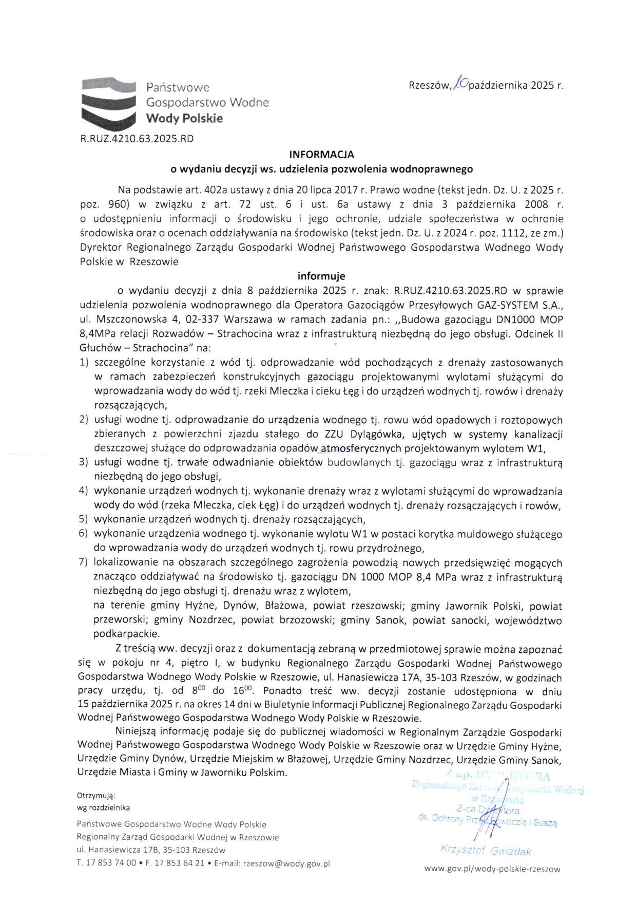 Informacja o wydaniu decyzji ws. udzielenia pozwolenia wodnoprawnego przez PGW „Wody Polskie”
