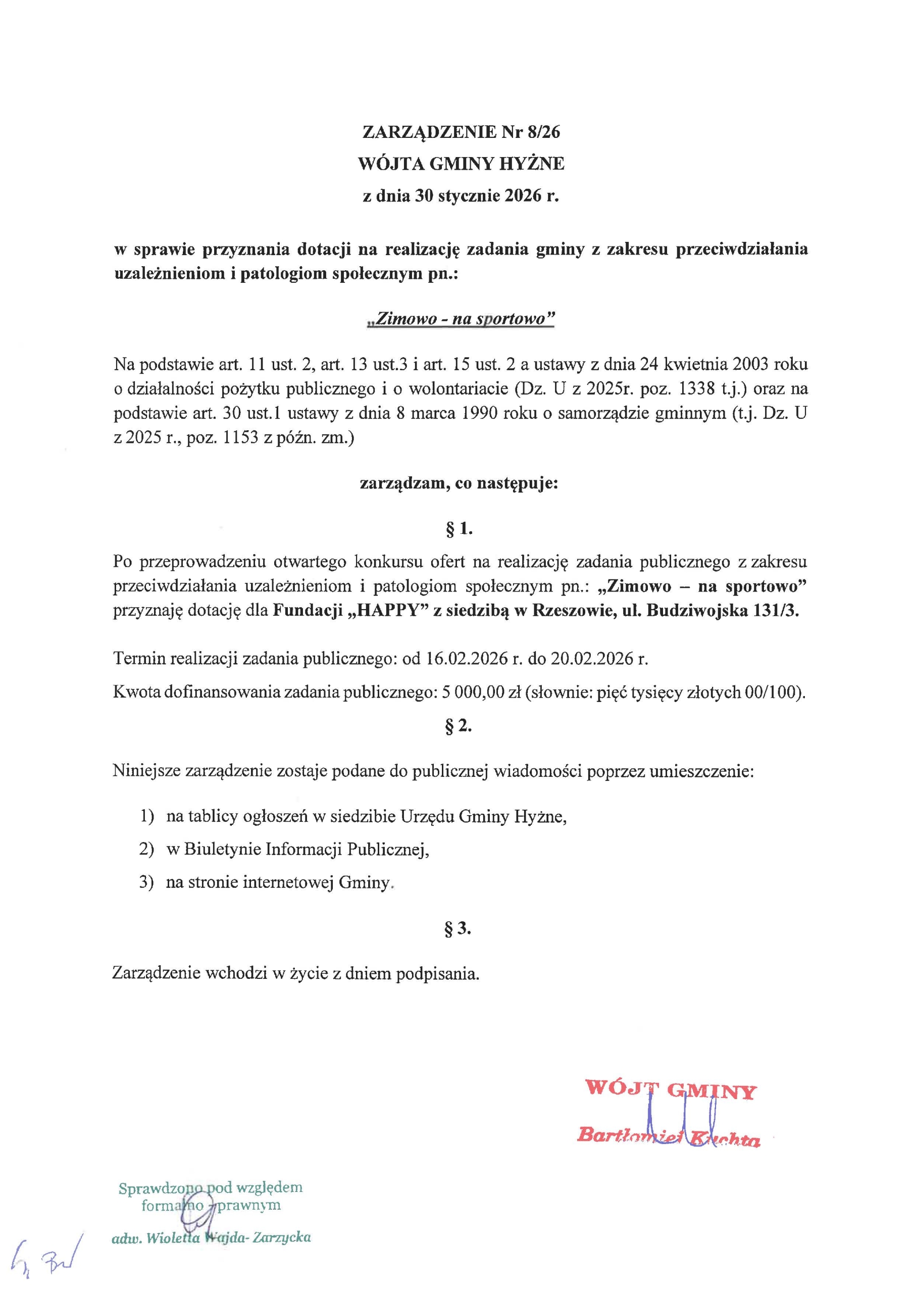 Zarządzenie Nr 8/26 z dnia 30.01.2026 r. Wójta Gminy Hyżne w sprawie przyznania dotacji na realizację zadania gminy z zakresu przeciwdziałania uzależnieniom i patologiom społecznym pn.: „Zimowo-na sportowo”