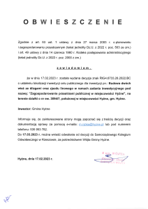 Obwieszczenie – Budowa dwóch wież ze ślizgami oraz zjazdu linowego w ramach zadania inwestycyjnego pod nazwą: „Zagospodarowanie przestrzeni publicznej w miejscowości Hyżne”